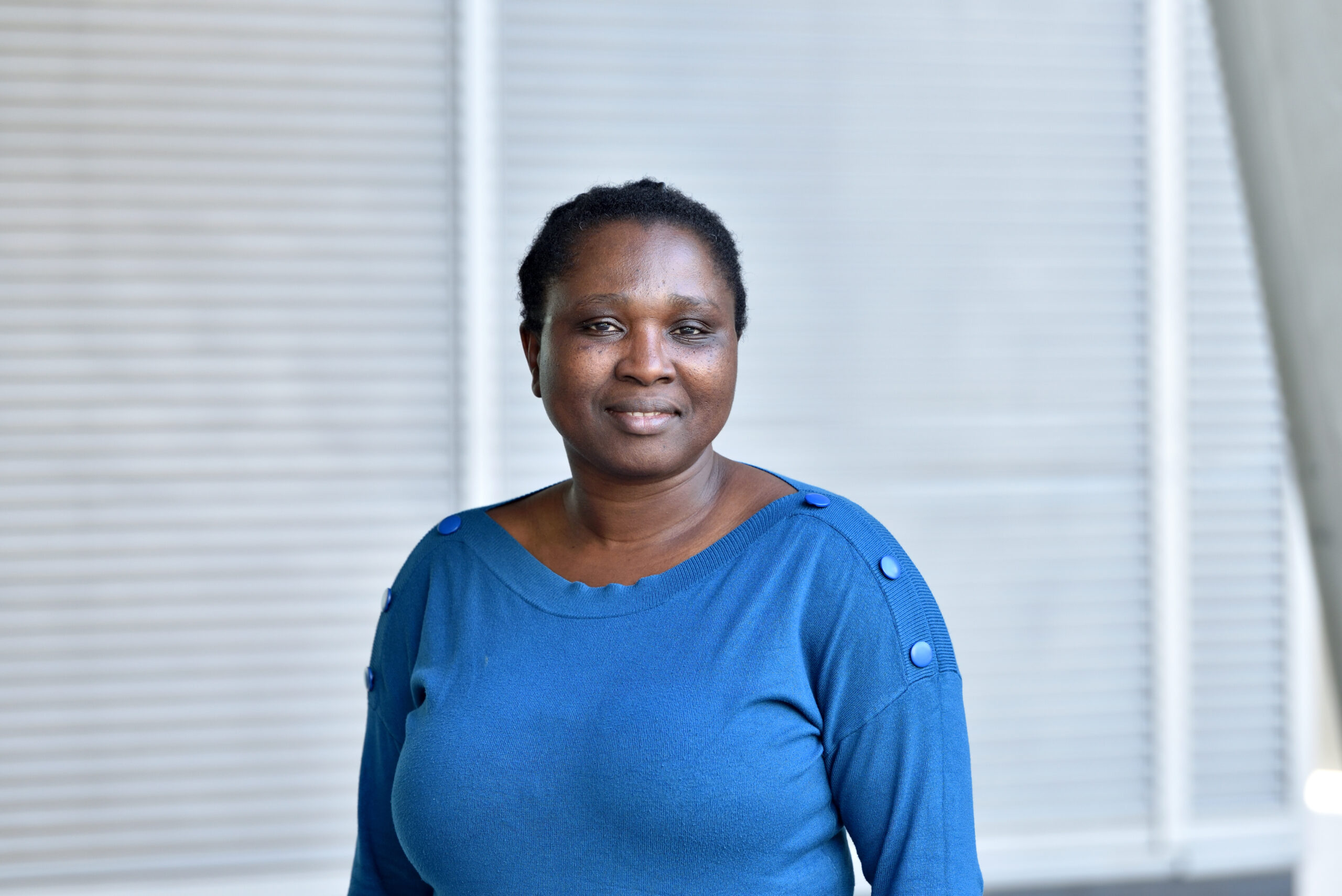 Elizabeth Olanloye wearing a blue top and smiling at camera for portrait image